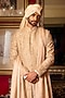Featuring a champagne pink sherwani in tissue base with hand knotted detail and metallic threadwork. It is paired with a cotton silk kurta, churidar pants, silk dupatta, juttis and a safa. Style it with malas for a wedding or engagement ceremony.