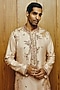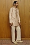 Featuring a cream pink kurta in raw silk base with hand embroidery. It is paired with beige cotton silk flared trousers. Style it with a pair of loafers and a bracelet for daytime weddings, engagement or sangeet functions.