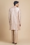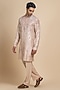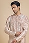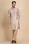 Featuring a dusky rose kurta in raw silk base with embellishments and embroidery. It is paired with pants. Style it with kolhapuri sandals for a festive occasion, wedding or engagement ceremony, exuding traditional charm and elegance.