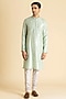 Featuring an ice blue kurta in raw silk base. It is paired with pants. Accentuate it with kolhapuris or embroidered juttis for an elegant yet easy going look, perfect for pooja ceremonies, festive gatherings or cultural celebrations.