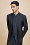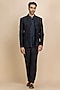 Featuring an indigo blue short open jacket in raw silk base with hand embroidery. It is paired with a dupion silk shirt and japanese crepe trousers. Style it with mojaris for a festive occasion, reception, sangeet, wedding or engagement ceremony, exuding traditional charm and elegance.
