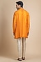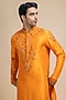 Featuring a marigold kurta in raw silk base with beadwork and paisley embroidery. It is paired with beige pants. Style it with kolhapuri sandals for a festive occasion, haldi, wedding or engagement ceremony, exuding traditional charm and elegance.
