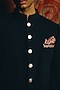 Featuring a navy blue bandhgala in japanese crepe base. It is paired with pants and a blush pink pocket square. Style it with classic loafers and a watch for a refined traditional look, Perfect wear for festive gatherings or sangeet nights.