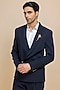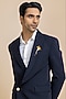 Featuring a navy blue tuxedo in japanese crepe base. It is paired with a cotton shirt and a metallic lapel pin. Style it with shoes for a reception, cocktail, sangeet or engagement ceremony.