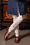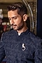 Featuring a deep navy blue achkan in raw silk base with hand embroidery. It is paired with a cotton silk kurta and churidar pants. Style it with malas and juttis for a wedding, sangeet or engagement ceremony.