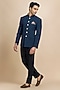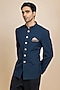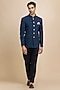 Featuring a navy blue bandhgala in twill base with gold button detail. It is paired with black cotton silk trousers and a silk pocket square. Style it with mojaris for a reception, wedding, sangeet or engagement ceremony, exuding traditional charm and elegance.