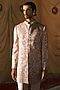 Featuring a peach sherwani in dutch satin base with thread metallic embellishment. It is paired with a dupion silk kurta and suiting trousers. Style it with embroidered mojaris for a regal ensemble, ideal for wedding ceremonies or grand festive occasions.