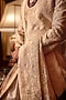 Featuring a pink sherwani in raw silk base. It is paired with a dupion silk kurta, chinese crepe pants, a raw silk belt and an organza dupatta. Accentuate it with pair of mojaris for a wedding or engagement ceremony.