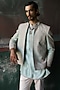 Featuring a pistachio-frost colored front-open indowestern jacket in raw silk base with dori detailing. It is paired with a dupion silk kurta and suiting trousers. Style it with mojaris or loafers for a refined ensemble, ideal for festive celebrations or wedding functions.