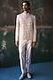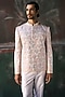 Featuring a platinum-colored bandhgala jacket in dutch satin base with floral dori embroidery. It is paired with suiting pants. Style it with classic mojaris for a sophisticated ensemble, ideal for engagement functions or festive celebrations.