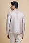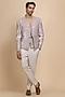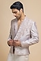 Featuring a rosy brown short open jacket in raw silk base with tonal hand embroidery. It is paired with a V-neck shirt and fluid japanese silk trousers. Style it with mojaris for a wedding, sangeet or engagement ceremony.