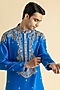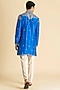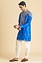Featuring a royal blue kurta in raw silk base. It is paired with pants. Accentuate it with kolhapuris or embroidered juttis for an elegant yet easy going look, perfect for pooja ceremonies, festive gatherings or cultural celebrations.