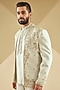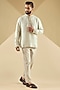 Featuring a sea-breeze colored front-open indowestern jacket in raw silk base with floral dori embroidery. It is paired with a dupion silk kurta and suiting trousers. Style it with mojaris or loafers for a refined ensemble, ideal for festive celebrations or wedding functions.