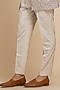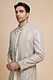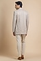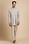 Featuring a silver-ivory open jacket in raw silk base with tonal motifs and hand embroidery. It is paired with a dupion silk kurta and cotton silk trousers. Style it with mojaris for a wedding, sangeet or engagement ceremony.