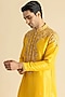 Featuring a yellow kurta in raw silk base. It is paired with pants. Accentuate it with pair of kolhapuri sandals and a bracelet for a festive occasion, wedding, engagement or haldi ceremony.