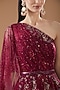 Featuring a maroon gown in shimmer tulle base with sequins and zardosi embroidery. It is paired with a matching leather embellished belt.