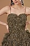 Featuring a metallic green flared gown in shimmer tulle base with micro japanese cutdana and crystal embellishments.