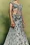 Featuring a mint green cocktail lehenga in net base with hand embroidery. It is paired with a tulle blouse and a dupatta. Style it with statement jewellery and embellished heels, perfect for a wedding, cocktail or sangeet ceremony.