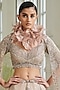 Featuring a muted pink bridal lehenga in shimmer tulle base with pink, silver, and gold ombre pearl embroidery. It is paired with a matching blouse and a dupatta having feathers embellishments.