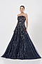 Featuring a navy blue bridal gown in shimmer tulle base with feather embellishments.