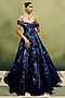 Featuring a navy blue ball gown in organza base with hand embroidery. Style it with statement jewellery and embellished heels, perfect for a cocktail or sangeet ceremony.
