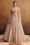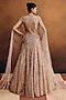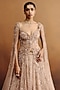 Featuring a nude jacket kurta in shimmer net base with hand embroidery. It is paired with a skirt. Style it with statement dangler earrings, sleek low bun and embellished heels, perfect for a cocktail, wedding, engagement or sangeet ceremony.