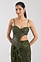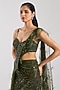 Featuring a olive skirt saree in tulle base with hand embroidery. It is paired with a blouse. Accentuate it with dangler earrings and heels for a reception, cocktail, wedding or sangeet ceremony.