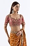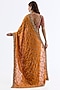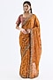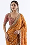 Featuring an orange saree in chiffon base. It is paired with a raw silk blouse and an inner skirt. Accentuate the look with polki jewellery and block heels for festive occasions or wedding ceremonies, making it a seamless fusion of heritage and haute elegance.