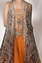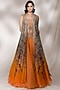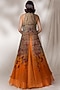 Featuring an orange lehenga in chiffon and organza base with zardosi embroidery. It is paired with a matching blouse and jacket.