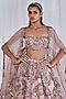 Featuring a pink lehenga in organza base with chantilly embroidery. It is paired with a chantilly corset having pearl work, an organza embellished cape having feathers and a leather belt. Style it with statement jewellery and heels for a sangeet or wedding ceremony.