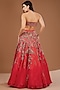 Featuring a red lehenga in organza base with chantilly embroidery. It is paired with a matching chantilly corset having pearl work, an organza embellished cape having feathers and a leather belt. Style it with statement jewellery and heels for the perfect bridal look.