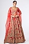 Featuring a red lehenga in raw silk base with dori and heirloom embroidery. It is paired with an embroidered blouse, a dupatta and a veil. Accentuate it with statement jewellery and heels for a wedding or engagement ceremony.