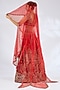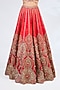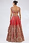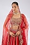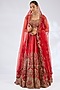 Featuring a red lehenga in raw silk base. It is paired with a blouse, dupatta and a veil. Adorned with heavy jewellery, embroidered wedges and potli bag, the ensemble exudes a majestic bridal charm.