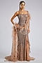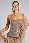 Featuring a rose gold lehenga in tulle net base with feather. It is paired with a corset and a boa. Accentuate it with zircon jewellery and heels for a reception, sangeet or cocktail party.