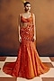 Featuring a tangerine orange skirt in net base with mirror and sequins hand embroidery. It is paired with a blouse and a drape. Style it with statement dangler earrings, sleek low bun and embellished heels, perfect for a cocktail, wedding, engagement or sangeet ceremony.