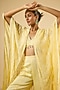 Featuring a butter lemon cape in satin base with an attached lining and sequins embroidery. It is paired with satin pants and a crop top. Accentuate it with pearl or kundan stud earrings and embellished flats for a festive occasions, pre-wedding ceremonies or intimate parties.