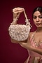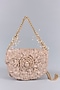 Featuring a rose gold handcrafted clutch in luxe microfiber suede base with japanese bugle beads hand embroidery and heat embossed logo. It has a detachable chain strap. This versatile accessory can be styled as a crossbody, shoulder bag or grab handbag, perfect for both casual outings and sophisticated occasions.