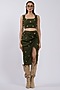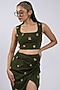 Featuring an olive green top in cotton base with metal chain embellishments. It is paired with an embellished skirt. Style this skirt set with a pair of heels and a cape for an evening look.