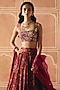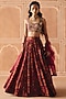Featuring a berry plum gathered lehenga in dupion silk base with print. It is paired with an embroidered blouse and an organza embroidered dupatta. Accentuate it with polki jewellery and heels for a festive occasion or wedding ceremony.