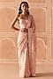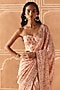 Featuring a blush pink saree in dupion silk and organza base with print and hand embroidery. It is paired with an embroidered corset. Accentuate it with polki earrings and heels for a festive occasion or sangeet ceremony.