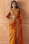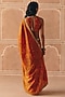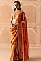 Featuring a burnt orange saree in dupion silk base with print. It is paired with an embroidered blouse. Accentuate it with polki earrings and heels for a festive occasion or sangeet ceremony.