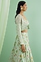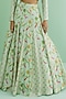 Featuring a green lehenga in dupion silk base with floral print. It is paired with a matching crop top and a hand embroidered jacket.