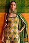 Featuring a green and yellow tunic in dupion silk base with zari, sequins, zardosi and mirror hand embroidery. It is paired with ikat digital printed kalidar pants and a dupatta. Accentuate it with polki earrings and block heels for festive occasions or daytime celebrations.