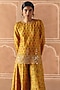 Featuring a marigold yellow kurta in dupion silk base with embroidery. It is paired with printed kali pants. Accentuate it with dangler earrings and heels for a festive occasion.