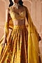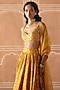 Featuring a marigold yellow gathered lehenga in dupion silk base with print. It is paired with an embroidered blouse and an organza embroidered dupatta. Accentuate it with polki jewellery and heels for a festive occasion or haldi ceremony.