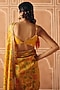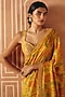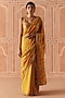 Featuring a marigold yellow saree in dupion silk base with print. It is paired with an embroidered blouse. Accentuate it with polki earrings and heels for a festive occasion or haldi ceremony.