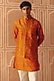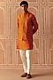 Featuring a burnt orange bundi jacket in dupion silk base with print. It is paired with a printed kurta and cotton silk pants. Accentuate it with pair of kolhapuris and antique gold brooch for festive occasions or pooja ceremony.