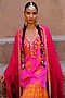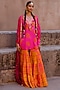 Featuring a pink short kurta in dupion silk and organza base with zari, sequins, zardosi and mirror hand embroidery. It is paired with orange and pink shibori and ikat digital printed sharara, including an organza embroidered dupatta. Accentuate it with polki earrings and block heels for festive occasions or daytime celebrations.