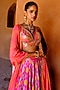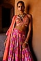 Featuring a pink pleated lehenga in dupion silk and organza base with shibori and ikat digital print. It is paired with a hand embroidered blouse and an organza hand embroidered dupatta. Accentuate it with polki jewellery and embellished heels for daytime weddings or carnival ceremony.