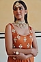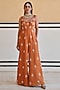 Featuring a copper colored jumpsuit in raw satin base with floral boota embroidery and a square neckline. Accentuate it with statement jewellery and heels for an evening look.